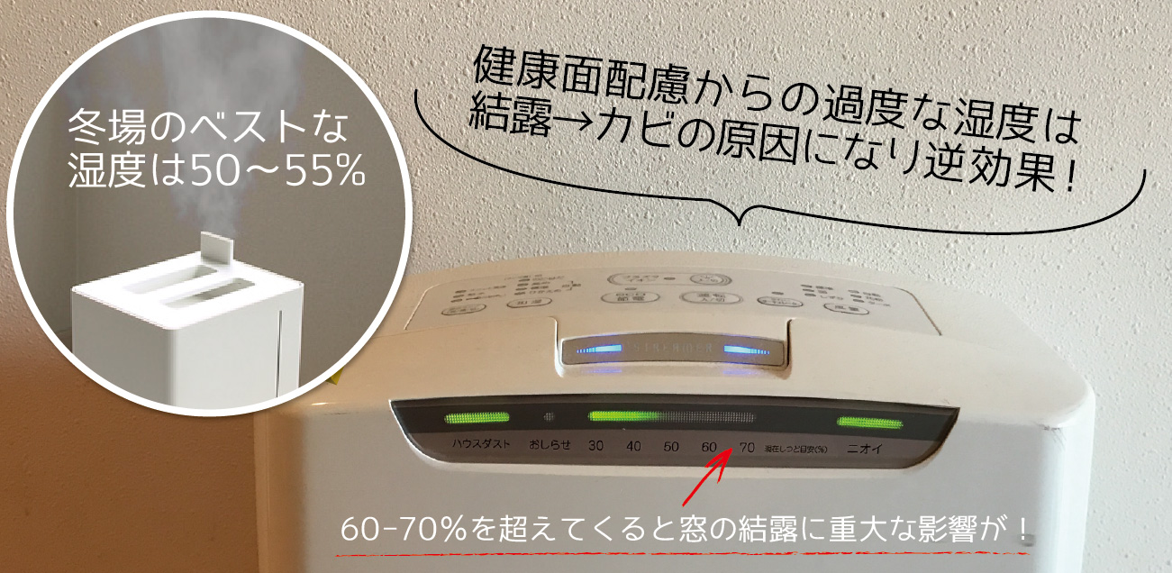 冬場、同じ暖かい室温の状況であっても、お部屋の湿度を10%下げるだけで外気温での影響で言うならば、 約5℃の違いに相当します。